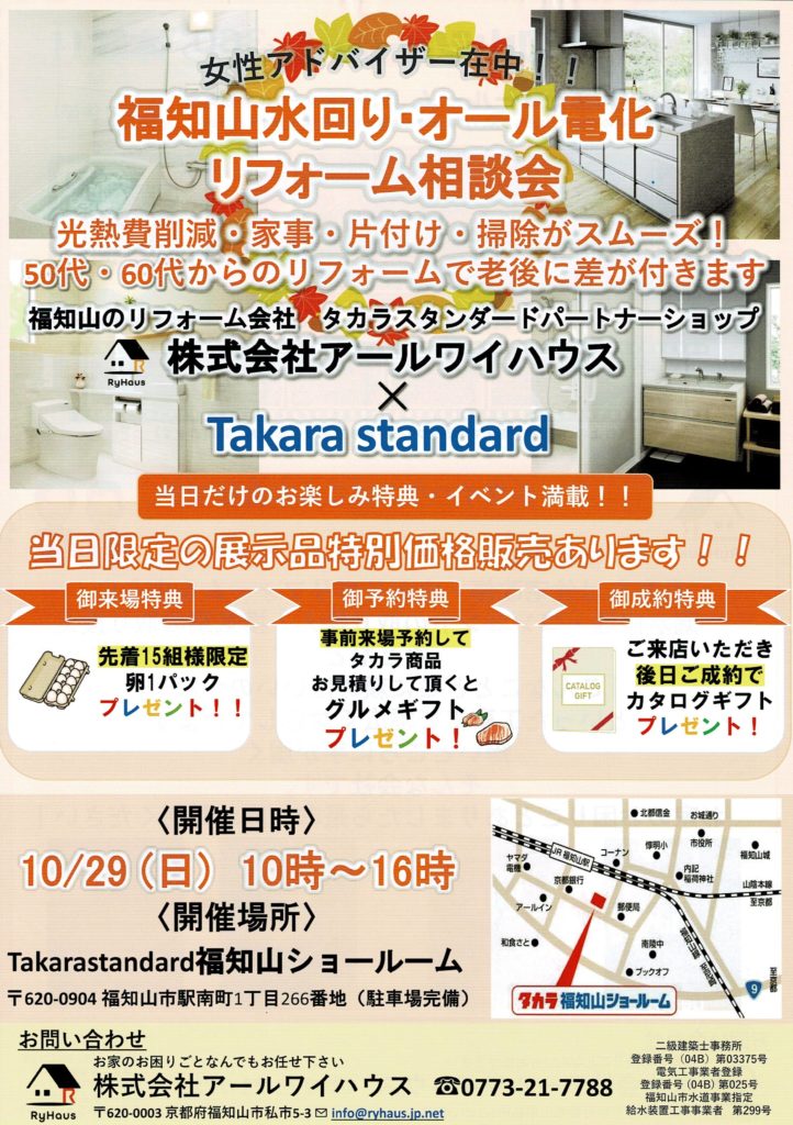 タカラスタンダード合同展示会 2023年10月29日 最終更新日時 : 2023年11月11日 RyHaus タカラスタンダード福知山ショールームにて合同展示会を行いました。 お休みの日にも関わらず多数のご来場ありがとうございました。 厚く御礼申し上げます。